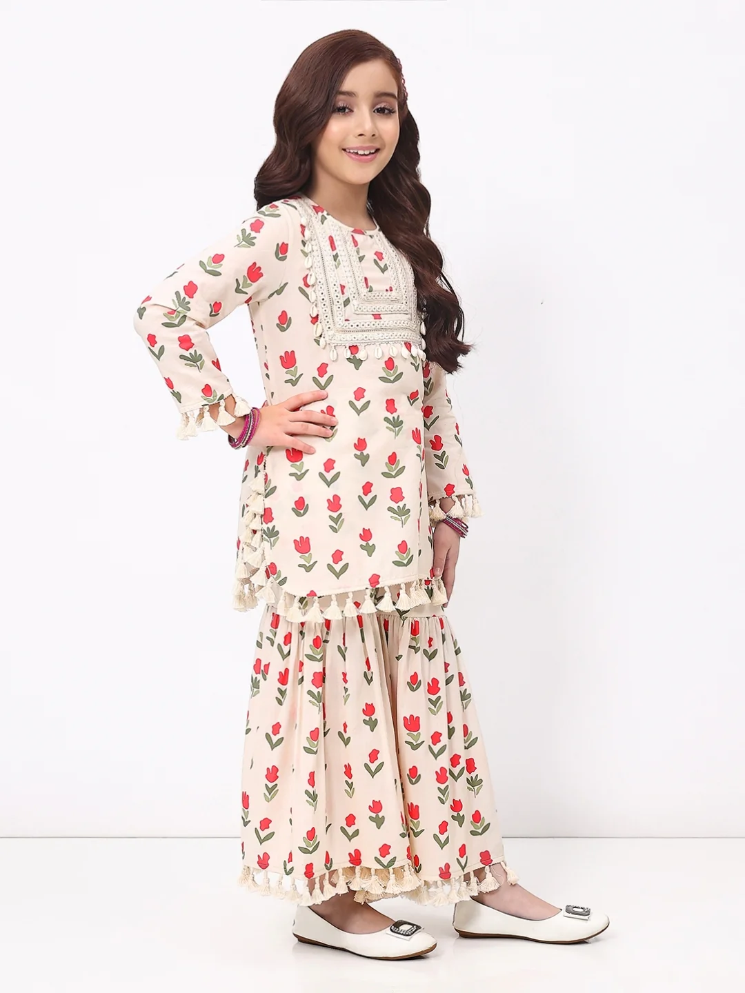 Girls Off white Floral Print Ethnic kurti and sharara Set