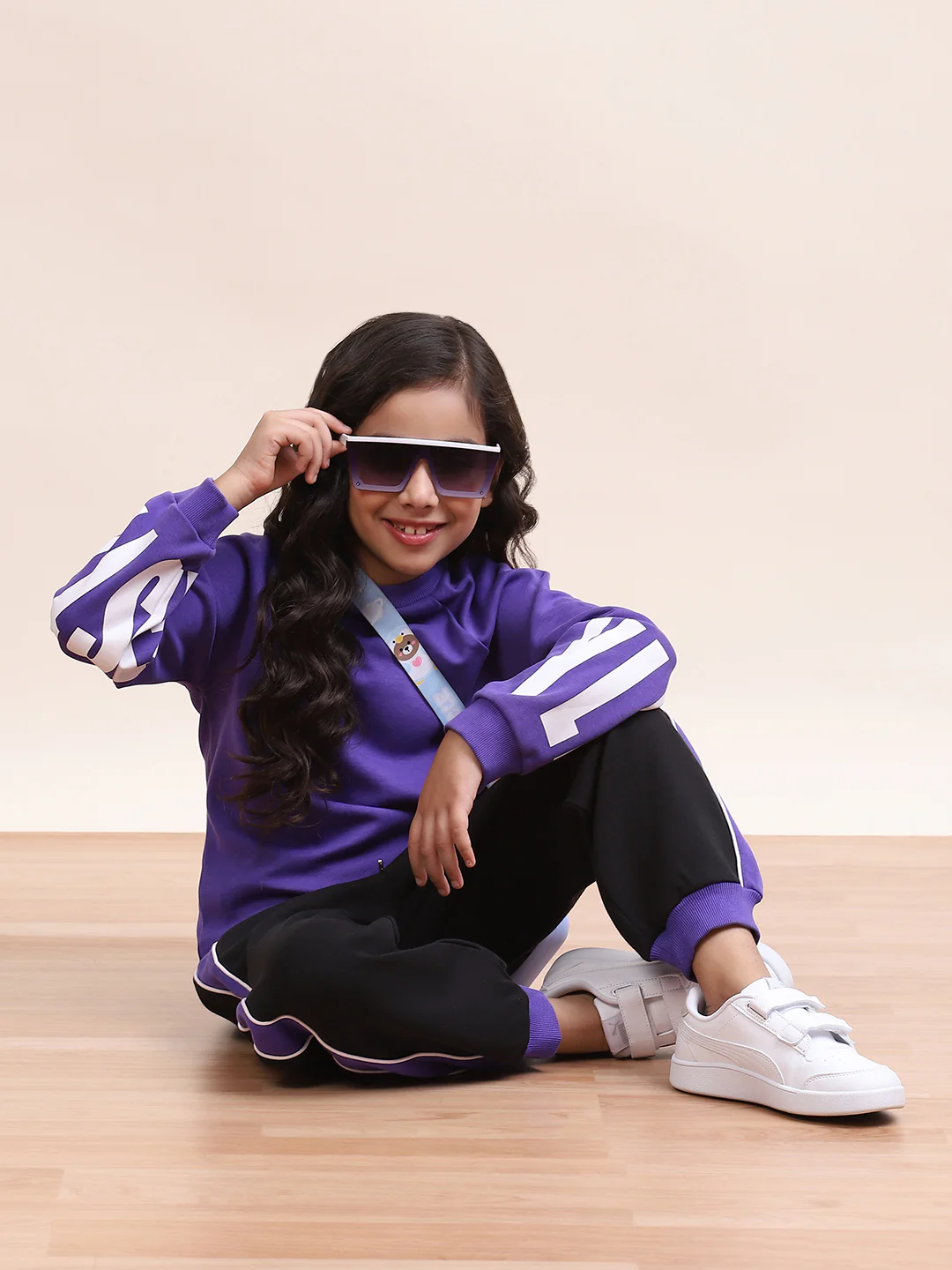 Black joggers, purple side stripes