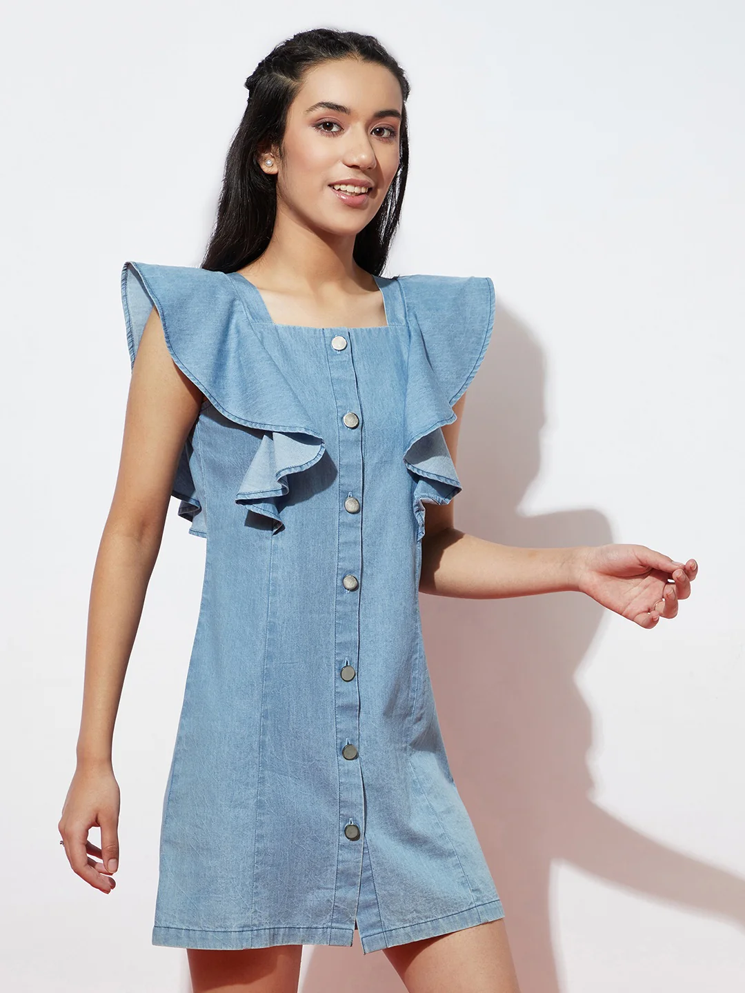 The Ice Blue Denim Flutter Sleeve Dress with Metal Buttons is a stylish and feminine garment perfect for warm weather or casual occasions.